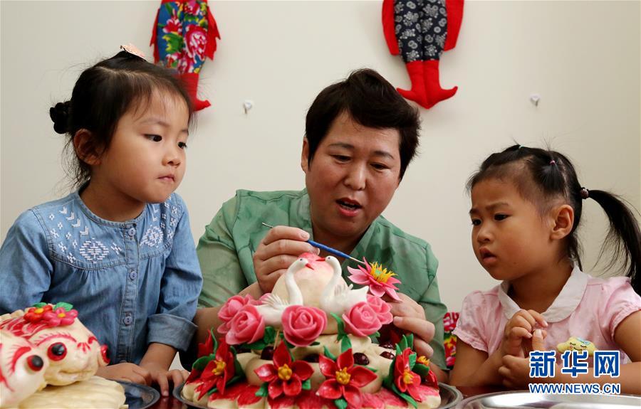山東省棗莊市非物質(zhì)文化遺產(chǎn)“魯南花饃”傳承人王欣(中)