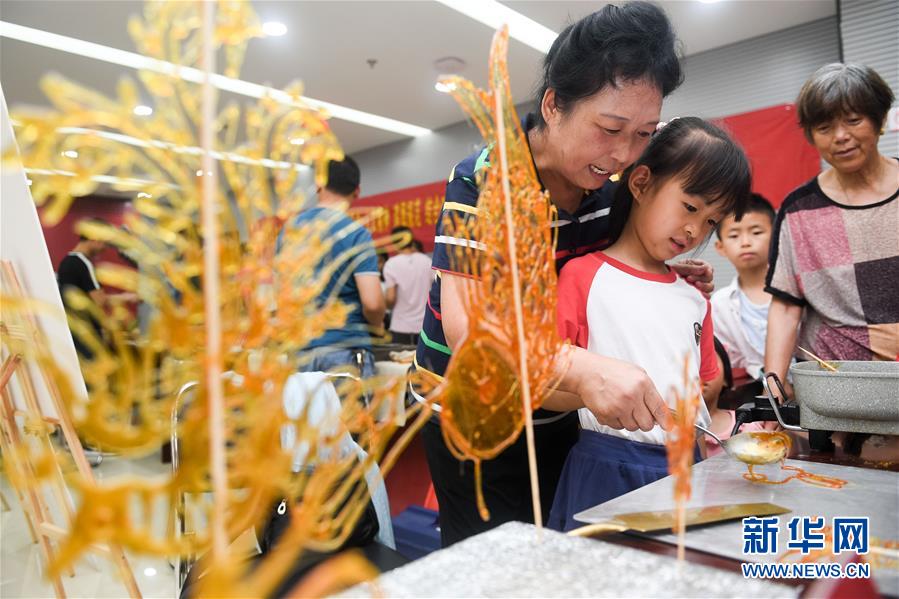 非遺傳承人張?jiān)破迹ㄗ螅┰诮绦∨笥堰M(jìn)行糖畫(huà)創(chuàng)作