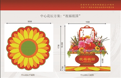 巨型花籃的北側(cè)是玻璃鋼制成的紅色籃體。今天凌晨,兩輛130噸吊車(chē)駛?cè)胩彀查T(mén)廣場(chǎng),把花盤(pán)緩緩吊裝到籃體上。北京市花木有限公司相關(guān)負(fù)責(zé)人介紹,吊裝過(guò)程是有一定難度的,因?yàn)榛ūP(pán)體量大、分量重,要想平穩(wěn)、安全地吊裝到籃體上,需要精準(zhǔn)把握平衡?!罢G闆r下,要花費(fèi)一個(gè)小時(shí)左右才能完成。”吊裝完成后,整個(gè)花壇頂高17米,花壇底部直徑50米。籃體南側(cè)書(shū)寫(xiě)“祝福祖國(guó),1949—2018”,籃體北側(cè)書(shū)寫(xiě)“歡度國(guó)慶,1949—2018”。