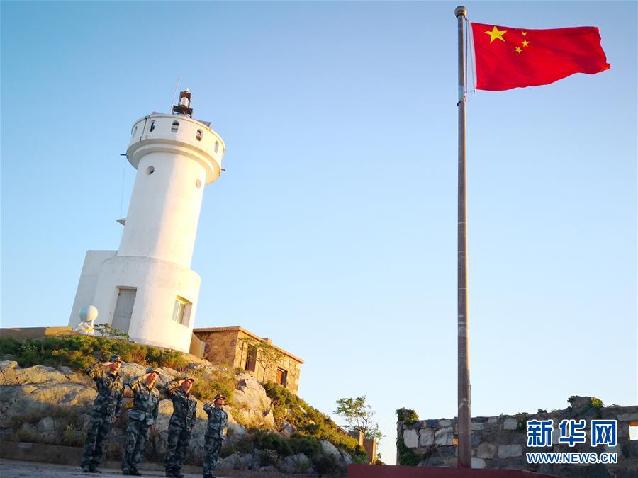 10月1日清晨,王仕花(右一)和守島民兵一起向國(guó)旗敬禮。 新華社記者 楊紹功 攝
