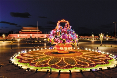 9月23日凌晨,天安門廣場高達(dá)17米的“祝福祖國”巨型花籃完工,正式與游客見面。除了天安門廣場,長安街沿線建國門至復(fù)興門的10處花壇,也為節(jié)日的北京增添喜慶。
