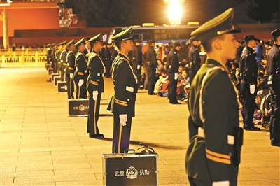 王帥把鬧鈴定到了凌晨0:00,鬧鈴一響,他立刻起身,穿好執(zhí)勤衣服,0:30準(zhǔn)時(shí)到達(dá)哨位。他執(zhí)勤的地方,就在國(guó)旗區(qū)護(hù)欄外。此時(shí),廣場(chǎng)的圍欄外已經(jīng)聚集了很多游客,時(shí)針指向1:15,廣場(chǎng)圍欄打開,游客們一窩蜂涌過來。為了防止擁擠、踩踏事件的發(fā)生,圍欄內(nèi)的武警戰(zhàn)士們40余人一組,在國(guó)旗區(qū)四周圍成“口”字型的人墻,有序引導(dǎo)游客們走進(jìn)“人墻”內(nèi),等待升旗儀式的開始。