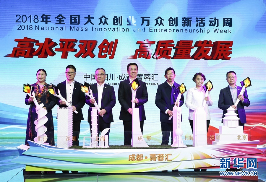 10月9日,2018年全國(guó)大眾創(chuàng)業(yè)萬(wàn)眾創(chuàng)新活動(dòng)周在四川成都拉開帷幕。中共中央政治局常委、國(guó)務(wù)院副總理韓正出席啟動(dòng)儀式并講話。這是在啟動(dòng)儀式上,韓正與創(chuàng)新創(chuàng)業(yè)者代表共同啟動(dòng)活動(dòng)周。 新華社記者 龐興雷 攝