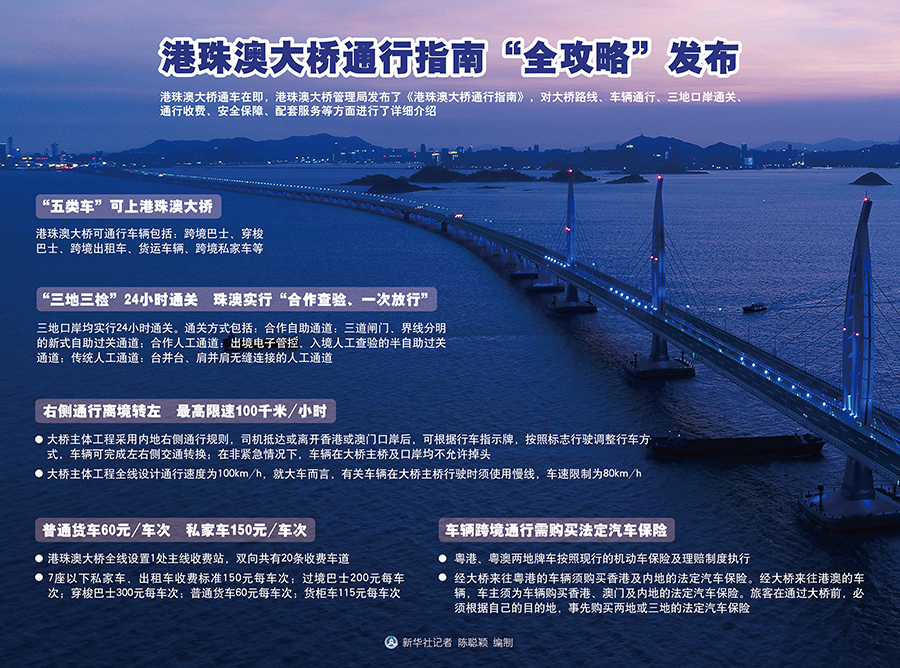 新華社廣州10月21日電(記者 周強(qiáng))港珠澳大橋通車在即,港珠澳大橋管理局發(fā)布了《港珠澳大橋通行指南》,對(duì)大橋路線、車輛通行、三地口岸通關(guān)、通行收費(fèi)、安全保障、配套服務(wù)等方面進(jìn)行了詳細(xì)介紹。