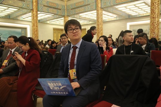 圖為2018年全國兩會,王子暉在總理記者會現(xiàn)場采訪。
