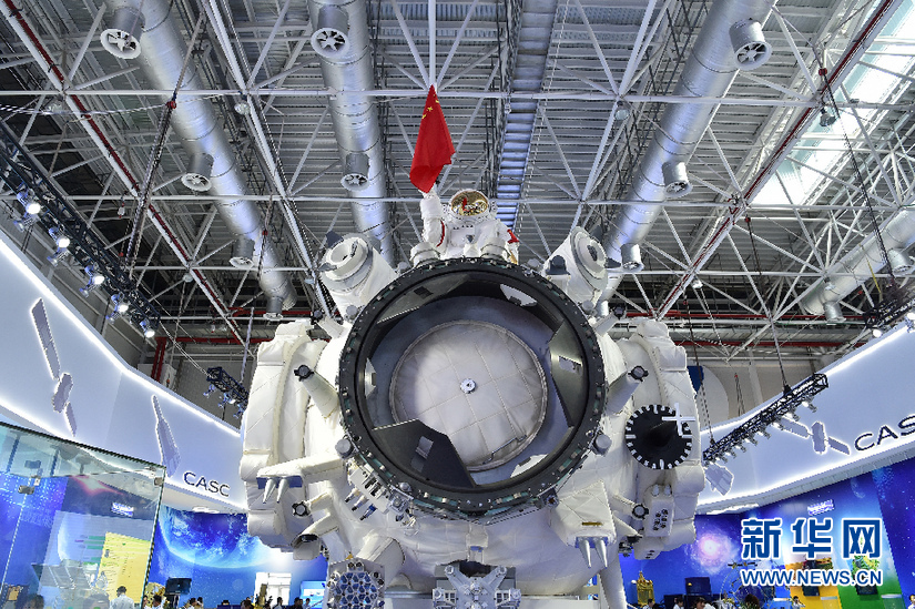 ??? 這是展出的空間站核心艙實物(工藝驗證艙)(11月5日攝)。 11月6日,在廣東珠海舉辦的第十二屆中國國際航空航天博覽會上,中國空間站“天和”號核心艙揭開神秘面紗,公開亮相。 新華社記者梁旭攝