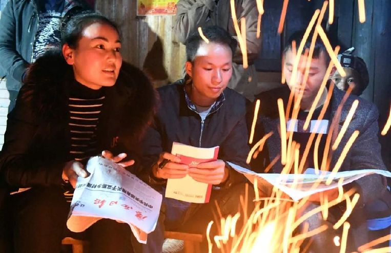 基層干部徐秋華(左)帶領廣西融水苗族自治縣四榮鄉(xiāng)榮地村村民學習“鄉(xiāng)村振興戰(zhàn)略”精神 張愛林 攝