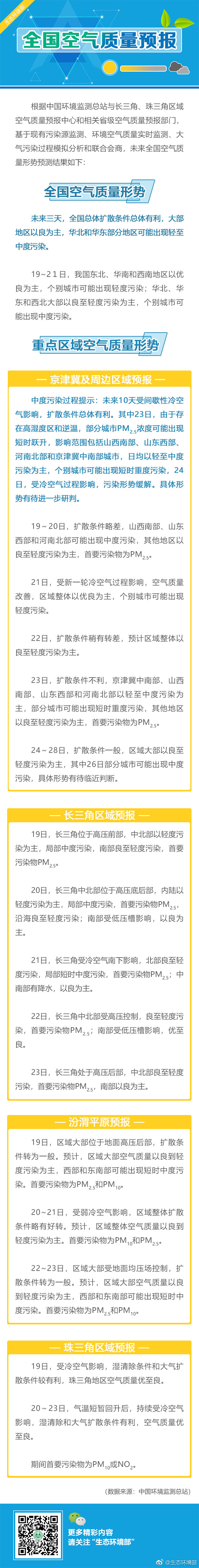 據(jù)生態(tài)環(huán)境部官方微博消息,未來三天(11月19-21日),全國總體擴(kuò)散條件總體有利,大部地區(qū)以良為主,華北和華東部分地區(qū)可能出現(xiàn)輕至中度污染。