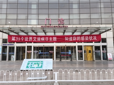 世界艾滋病日到來(lái)之際,地壇醫(yī)院在門(mén)診樓掛起條幅。
