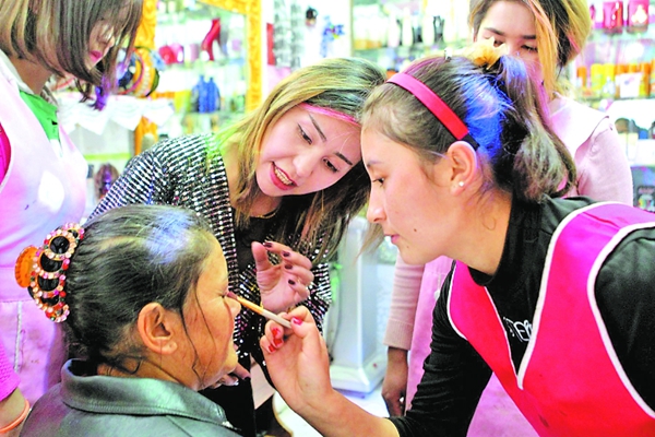 11月26日晚,喀什地區(qū)葉城縣吐古其鄉(xiāng)經(jīng)營美容美發(fā)連鎖店的祖麗胡瑪爾·艾木都拉(中)正在教村民美容方法。