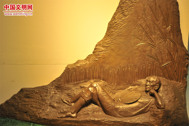 袁隆平“禾下乘涼夢(mèng)”雕塑。他曾夢(mèng)見(jiàn)水稻如高粱一般高,穗子和掃把一樣長(zhǎng),谷粒猶如花生米那樣大,人們可以坐在稻穗之下乘涼。湖南雜交水稻研究中心魏科 攝