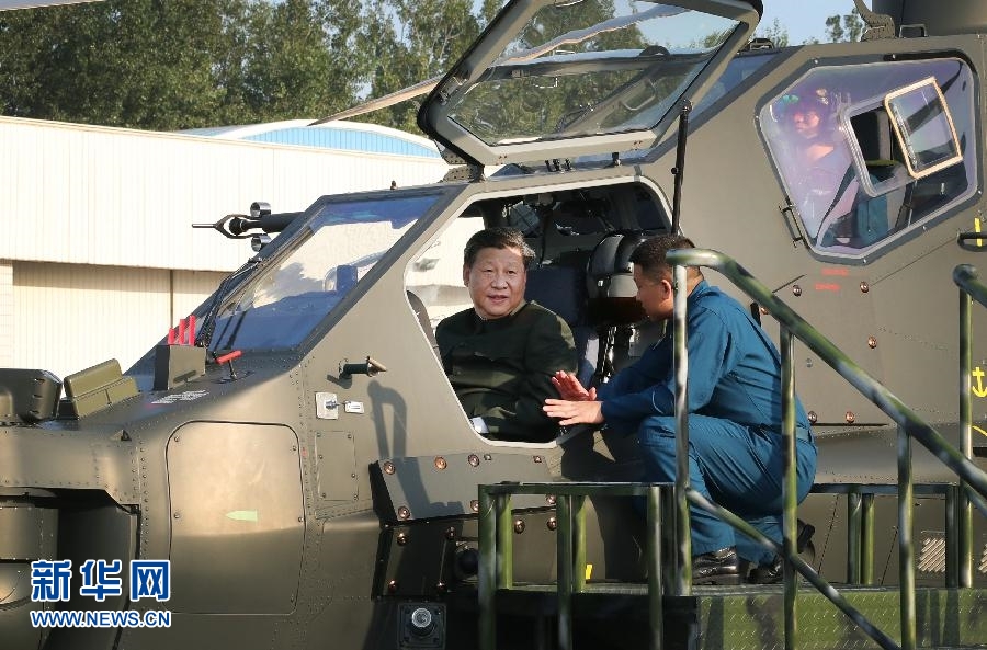 9月27日,習近平在視察79集團軍時登上直-10武裝直升機,親自操控機載武器及觀瞄系統,了解有關裝備情況。?新華社記者李剛攝