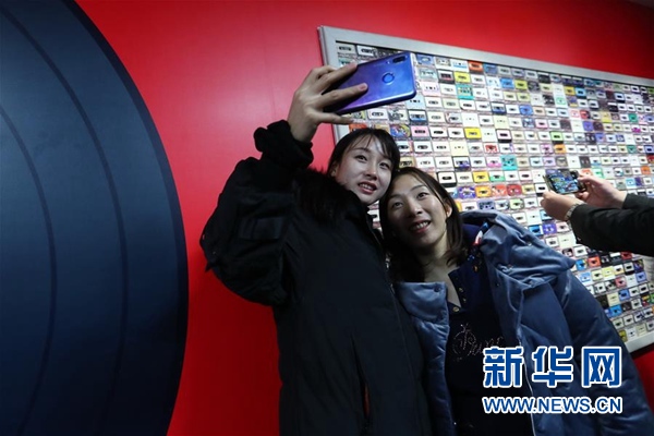 參觀者用手機(jī)為兩名小朋友在“時光博物館”內(nèi)留影。