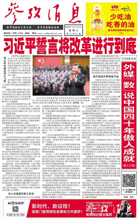 《參考消息》頭版報道改革開放40周年紀(jì)念大會 彩版