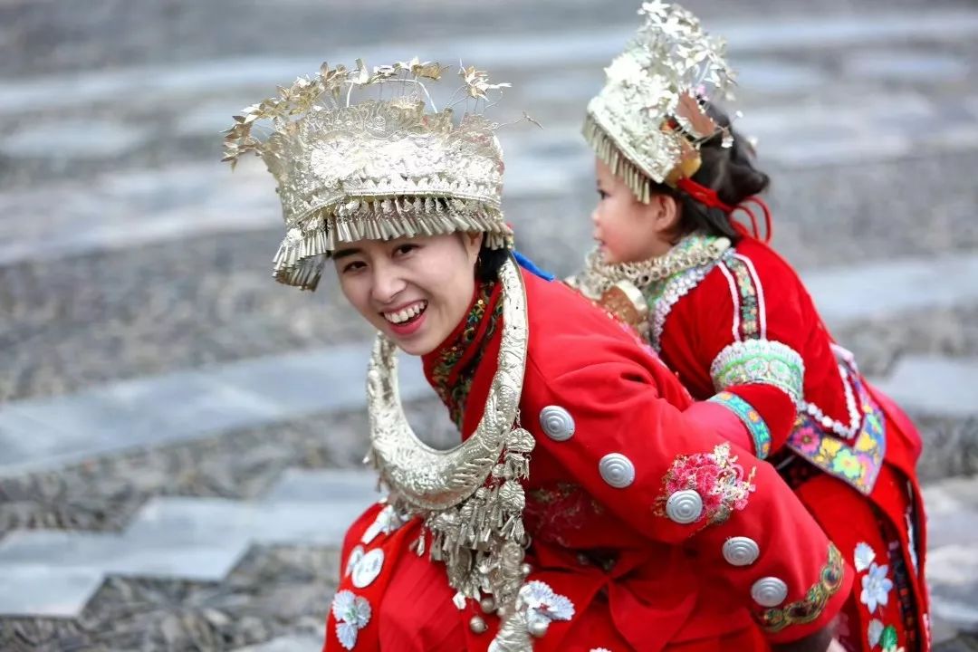 2018-01-05,貴州。美麗的苗族姑娘與孩子在嬉笑玩耍。作者:Godot