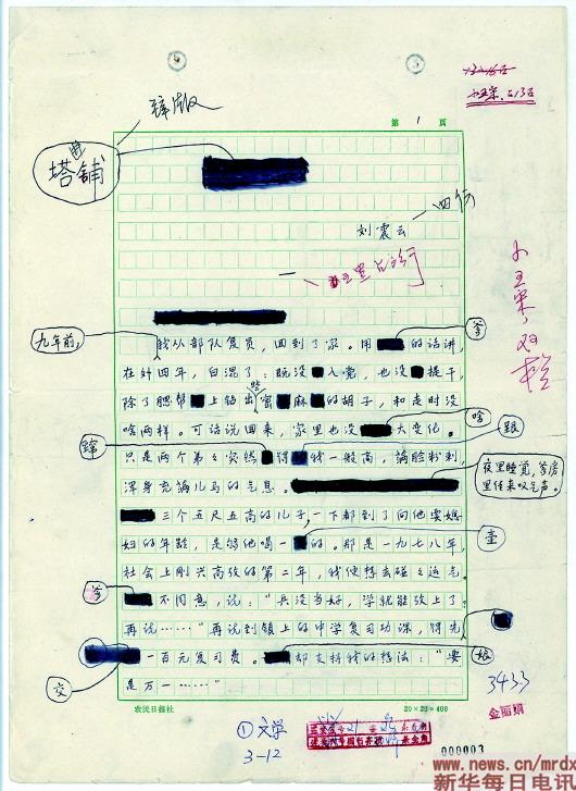 此次展出的手稿,還有手寫于農(nóng)民日?qǐng)?bào)社稿紙的劉震云小說(shuō)《塔鋪》。與莫言《透明的紅蘿卜》類似的,這篇“新寫實(shí)小說(shuō)”代表作的篇名也是修改過(guò)的,原名叫“河堤”,后來(lái)才改為“塔鋪”。盡管是謄清的手稿,其中仍充滿大量細(xì)微的刪減與成塊的涂抹?!安恍⌒摹备臑椤盁o(wú)意間”,“聚在”改為“聚到”,連“地”“的”“還”“又”等字眼也在斟酌后刪去,體現(xiàn)了作者對(duì)凝練精準(zhǔn)、不冗不贅的語(yǔ)言風(fēng)格的極致追求。