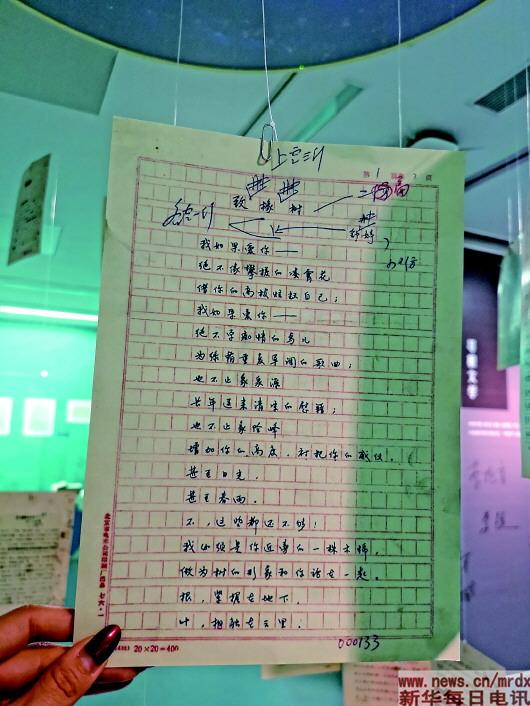 舒婷的詩(shī)歌代表作《致橡樹》就寫在42年前的兩頁(yè)“北京市電車公司印刷廠”印制的紅色格子稿紙上。如今它被串上線,懸掛在中國(guó)現(xiàn)代文學(xué)館的展廳中央。