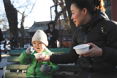 代女士已經(jīng)連續(xù)13年來雍和宮喝臘八粥了。她說,自己懷孕時偶然趕上雍和宮舍粥,因為自己是高齡產(chǎn)婦,許愿“母子平安”。隨后每年臘八她都帶上家人來喝上一碗粥,今年恰逢周末,她就帶上兒子一起來,“參與這個節(jié)日已經(jīng)成了我們家的傳統(tǒng),每年來這里祈福納祥。”(記者 張彤 攝影/記者 王飛)