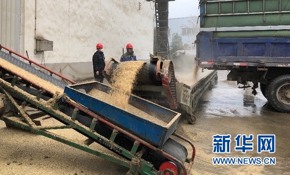 圖為安徽省鳳陽縣鳳臨糧貿(mào)有限公司卸糧現(xiàn)場。新華網(wǎng)汪亞/攝