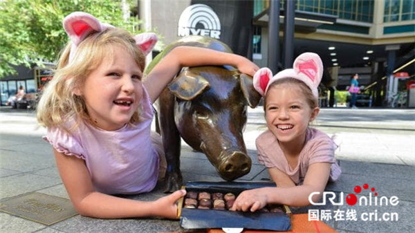 阿德萊德倫德?tīng)栙?gòu)物中心門(mén)前,兩個(gè)小女孩正在品嘗黑格公司推出的豬年巧克力。