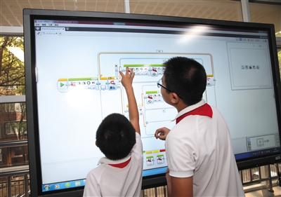 北京十八中學(xué)教育集團課程展示活動中的樂高機器人課上,學(xué)生正在為機器人編程。資料圖片/記者 王遠征 攝