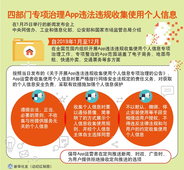 新華社北京1月25日電(記者王鵬)在25日舉行的新聞發(fā)布會上,中央網信辦、工業(yè)和信息化部、公安部和國家市場監(jiān)管總局介紹,自2019年1月至12月,在全國范圍內組織開展App違法違規(guī)收集使用個人信息專項治理工作,專項整治的App范圍涵蓋了電子商務、地圖導航、快遞外賣、交通票務等多方面。