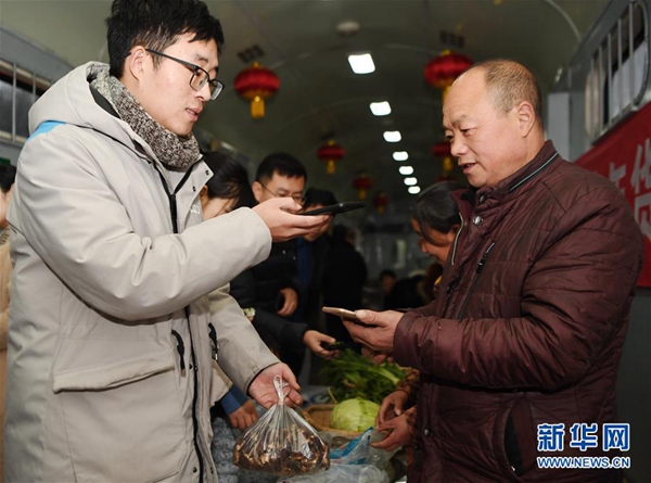 1月24日,乘客使用手機(jī)支付購(gòu)買周興安(右)自產(chǎn)的香菇產(chǎn)品。新華社記者 張博文 攝