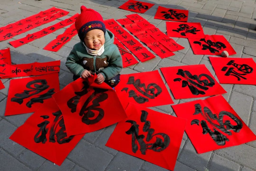 2019-1-28,河北涉縣更樂(lè)鎮(zhèn)。新春到來(lái)之際,書(shū)協(xié)的朋友們?cè)诖髲R里揮毫潑墨寫春聯(lián)送鄉(xiāng)親,村娃跑來(lái)湊熱鬧,蹲在福字里陶醉,幸福又快樂(lè)。作者:滄海