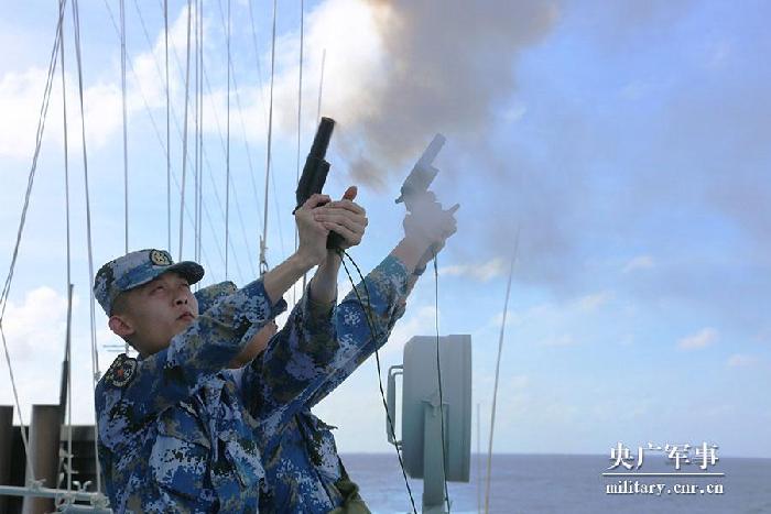 “砰!砰”,在喊話和警告射擊未果后,合肥艦又發(fā)出2枚信號彈,模擬實施攔阻射擊。此時,可疑商船終于放棄“抵抗”,減速停車。