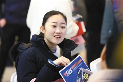 昨日,北京春季國展人才招聘會(huì)上,一名來應(yīng)聘的女士在與用人單位洽談。圖/視覺中國