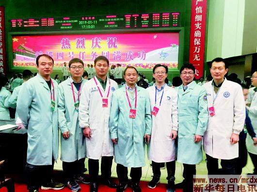 ▲1月11日,北京航天飛行控制中心,科普載荷總設(shè)計師謝更新(右四)、副總指揮楊小俊(右五)、主任設(shè)計師張元勛(右二)以及航天五院、中科院光電所等單位參研人員合影慶祝嫦娥四號任務(wù)圓滿成功?!∈茉L者供圖