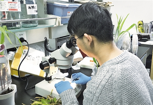 一名學(xué)生在實(shí)驗(yàn)室對(duì)玉米苗進(jìn)行真菌樣本采集。 記者 沈慧 攝