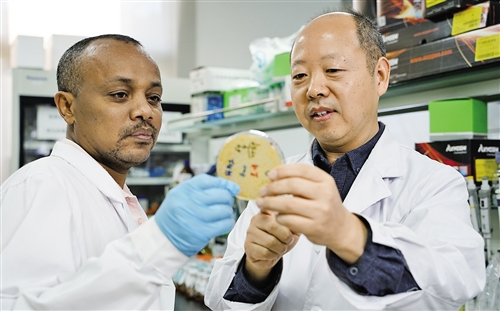 真菌學(xué)國(guó)家重點(diǎn)實(shí)驗(yàn)室的科研人員(右)在指導(dǎo)埃塞俄比亞留學(xué)生分離和鑒定酵母菌。 趙小平攝 (中經(jīng)視覺(jué))
