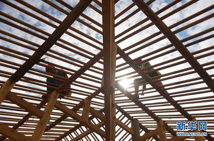 在湖北省宣恩縣曉關(guān)侗族鄉(xiāng),工人在建設(shè)吊腳樓(2018年7月26日攝)。2018年,當(dāng)?shù)卣_(kāi)始修建6座新的侗寨吊腳樓,為符合易地搬遷政策的貧困戶實(shí)施搬遷。新華社發(fā)(王俊 攝)