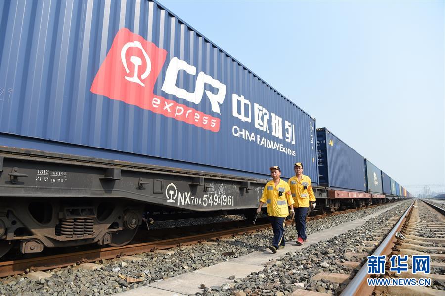 在位于重慶沙坪壩區(qū)的興隆場(chǎng)上行出發(fā)作業(yè)場(chǎng),進(jìn)行列檢作業(yè)的兩名貨車檢車員從中歐班列旁走過(guò)(2018年8月29日攝)。新華社記者 唐奕 攝