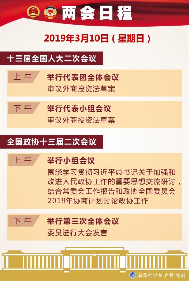 新華社北京3月9日電? 十三屆全國人大二次會議10日上午舉行代表團全體會議,審議外商投資法草案;下午舉行代表小組會議,審議外商投資法草案。