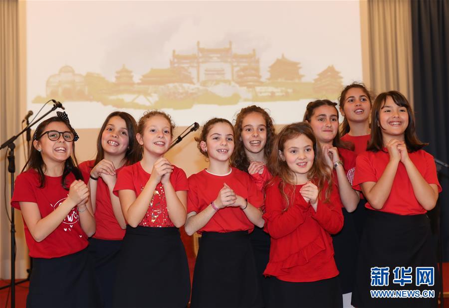 這是2019年2月8日,在意大利拉齊奧的古鎮(zhèn)蒂沃利,蒂沃利國立住讀學(xué)校的學(xué)生們在中國春節(jié)慶?;顒?dòng)上給大家拜年。 新華社記者 程婷婷 攝