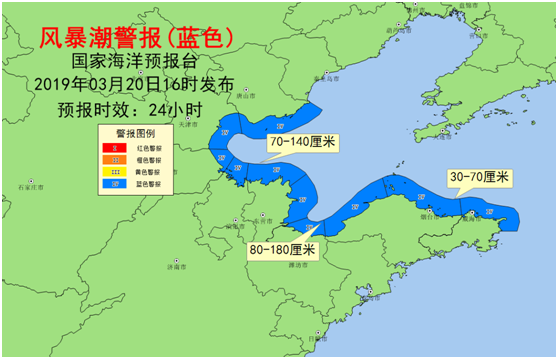 受冷空氣和出海氣旋的共同影響,預計:3月20日傍晚到21日中午,渤海灣將出現(xiàn)70到140厘米的風暴增水,萊州灣將出現(xiàn)80到180厘米的風暴增水,山東半島北部沿海將出現(xiàn)30到70厘米的風暴增水。上述岸段內的天津塘沽、河北曹妃甸、黃驊和山東濱州港潮位站將于21日凌晨出現(xiàn)達到當?shù)厮{色警戒潮位的高潮位。天津市、河北省唐山市、滄州市和山東省濱州市的風暴潮預警級別為藍色。