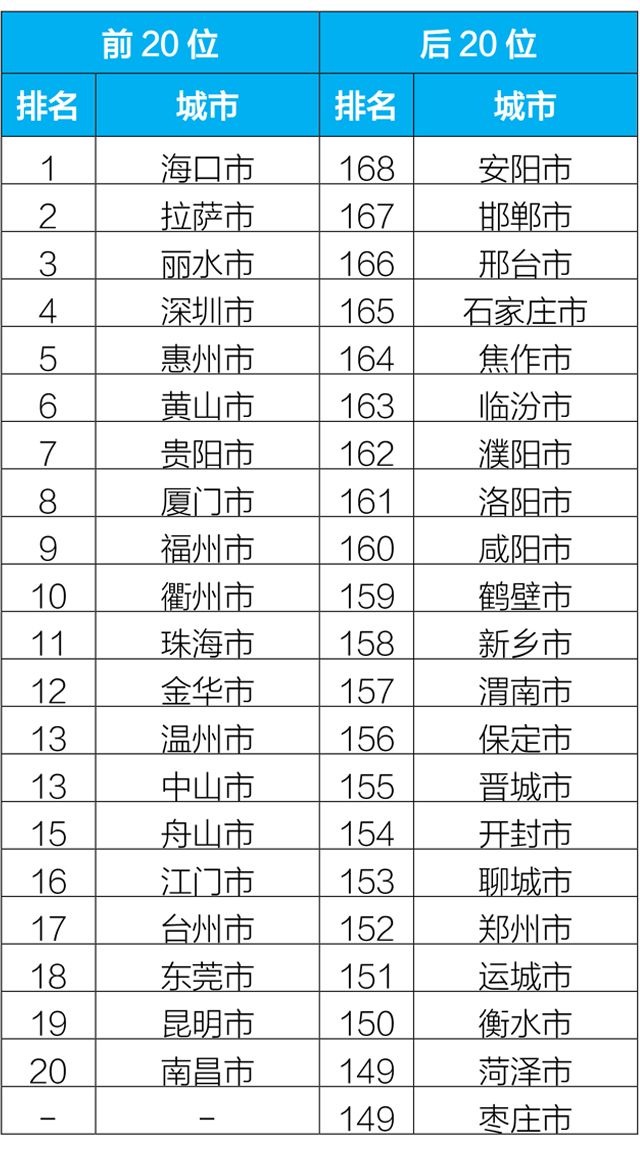 2019年2月168個(gè)重點(diǎn)城市排名前20位和后20位城市名單