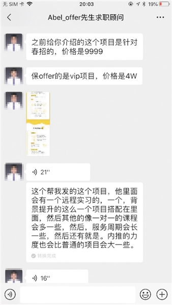 記者以春招求職學(xué)生身份與該助手取得了聯(lián)系,在詢問(wèn)過(guò)記者的畢業(yè)學(xué)校、學(xué)習(xí)專業(yè)、求職意向后,這位助手推薦了一個(gè)針對(duì)2019年春招的項(xiàng)目,該項(xiàng)目顯示服務(wù)周期三個(gè)月,包含了10個(gè)導(dǎo)師輔導(dǎo)課程及在線求職精品課,與海量求職資料包、求職信息,以及團(tuán)隊(duì)中“1v1貼心陪伴”。而這項(xiàng)春招項(xiàng)目的標(biāo)價(jià),高達(dá)8999至12999元。