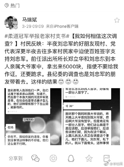 3月28日23時(shí)46分,舉報(bào)家鄉(xiāng)村官貪腐的柔道冠軍馬端斌通過個(gè)人實(shí)名認(rèn)證的微博發(fā)消息稱,其父親深夜被不明身份人員帶走,一時(shí)聯(lián)系不上父親,打電話一直沒人接,擔(dān)心其因?yàn)樽约号e報(bào)的事情被為難。