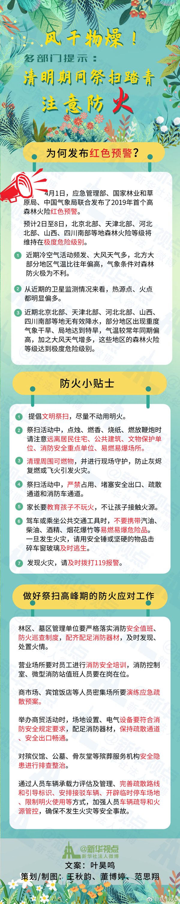 “清明節(jié)期間,我們也提倡文明祭掃,盡量不動(dòng)用明火,特別是在山林、草原動(dòng)火,極易失控引發(fā)火災(zāi),如果造成嚴(yán)重后果,要承擔(dān)法律責(zé)任。”王金華說,清明節(jié)防火,責(zé)任重大,還需多部門聯(lián)動(dòng),進(jìn)一步加強(qiáng)組織領(lǐng)導(dǎo),建立健全政府負(fù)責(zé)人牽頭,民政、公安、交通、林業(yè)等部門密切配合的應(yīng)急處置機(jī)制。