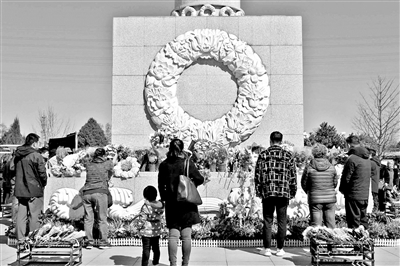 家屬手捧鮮花,在北京長(zhǎng)青生命紀(jì)念園生態(tài)葬紀(jì)念碑前祭奠逝者 攝影/本報(bào)記者 魏彤