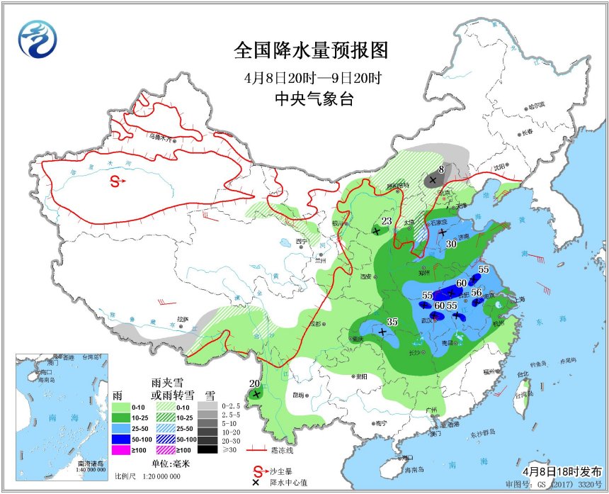 張濤:降水的主要影響時(shí)間為8日夜間到9日白天。北方地區(qū)以大范圍小到中雨的穩(wěn)定性降水為主,無雷電,影響區(qū)域主要集中在西北地區(qū)東部、內(nèi)蒙古中部、華北、黃淮等地。河北南部、河南北部、山東西部等地會達(dá)到大雨量級。除此之外,北方部分地區(qū)降水會經(jīng)過雨轉(zhuǎn)雨夾雪或雪的過程,轉(zhuǎn)化主要位置在山西北部、河南北部、北京北部等,內(nèi)蒙古中部局部地區(qū)會出現(xiàn)大雪天氣。南方的降水量相對較大,以中到大雨為主,部分地區(qū)有暴雨,江漢、黃淮南部、江淮、江南等區(qū)域會伴有雷電。河南南部和西部、安徽中北部、江蘇中北部和南部、湖北北部和南部、湖南西部等地的部分地區(qū)將有短時(shí)強(qiáng)降水天氣;河南南部、安徽中北部、湖北北部和東部等地的局地將有雷暴大風(fēng)或冰雹天氣。