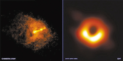 左圖 錢德拉X射線望遠(yuǎn)鏡與事件視界望遠(yuǎn)鏡同時拍攝的照片,顯示了M87星系中心黑洞的“相對論性噴流”。右圖 事件視界望遠(yuǎn)鏡拍攝的M87星系中心黑洞圖像。圖片來源:美國趣味科學(xué)網(wǎng)站