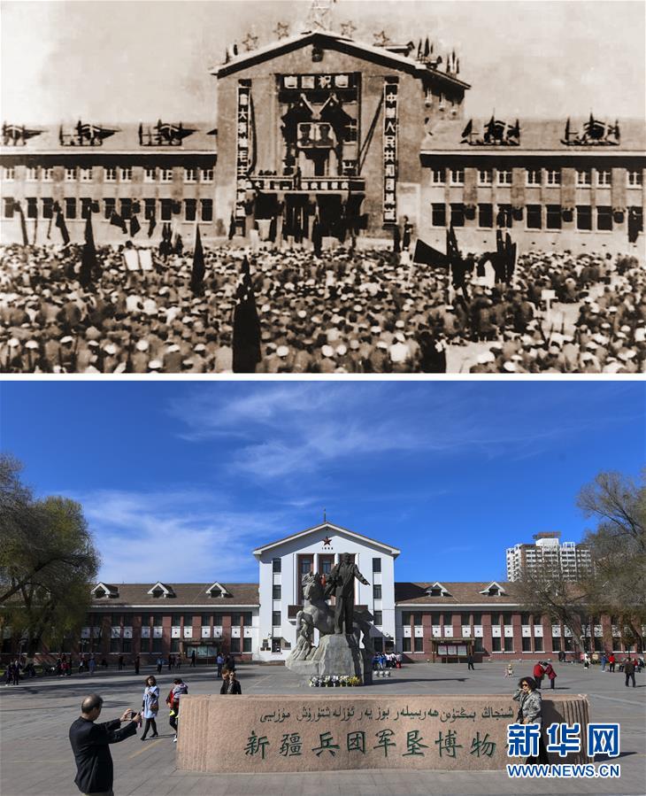 拼版照片:上圖為1952年10月拍攝的在石河子落成的中國(guó)人民解放軍第二十二兵團(tuán)司令部機(jī)關(guān)辦公大樓(新疆兵團(tuán)軍墾博物館提供);下圖為基于該建筑改建后的新疆兵團(tuán)軍墾博物館(新華社記者王菲4月9日攝)。新華社發(fā)