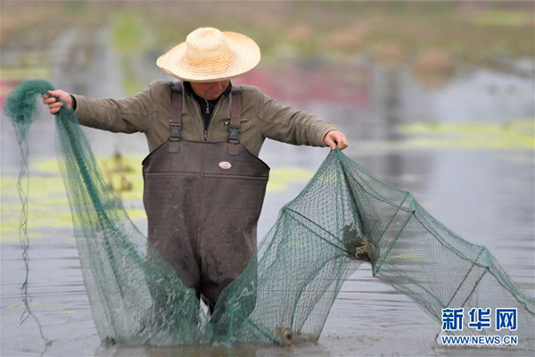 在湖南省南縣一處稻蝦蟹綜合種養(yǎng)基地,農(nóng)戶在捕收蝦蟹(3月13日攝)。新華社發(fā)(陳澤國 攝)