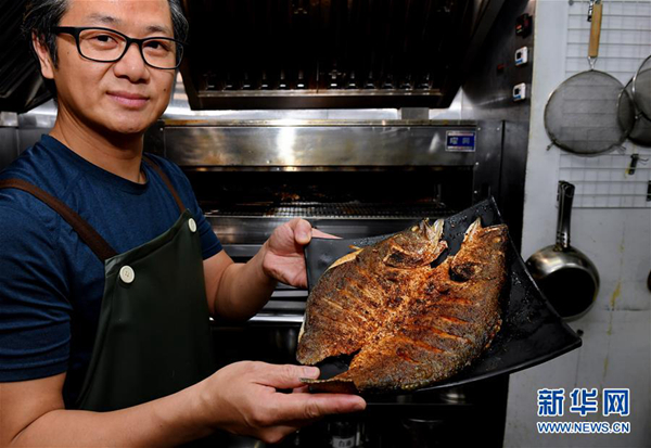 臺北市“一品言”餐館老板兼大廚劉添吉在展示烤魚(4月24日攝)。新華社記者 張國俊 攝