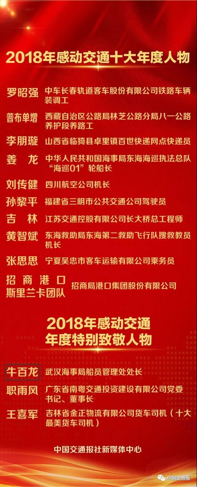 另外,將青春和生命奉獻給海事交通事業(yè)的武漢海事局船員管理處處長牛百龍;胸懷大愛,積極踐行“大道為公”理念的廣東南粵交通投資建設(shè)有限公司黨委書記、董事長職雨風;400萬公里安全駕駛、細心工作、熱心助人的吉林省物流貨車司機王喜軍榮獲“2018年感動交通年度特別致敬人物”稱號。