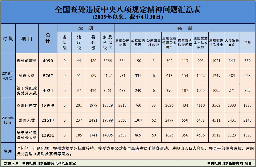 據(jù)中央紀委國家監(jiān)委網(wǎng)站消息,為掌握全國貫徹落實中央八項規(guī)定精神情況,中央紀委在各省區(qū)市和新疆生產(chǎn)建設(shè)兵團、各中央和國家機關(guān)、各中央企業(yè)和中央金融企業(yè)等建立了落實中央八項規(guī)定精神情況月報制度。2019年以來,截至4月30日,全國查處違反中央八項規(guī)定精神問題情況如下: